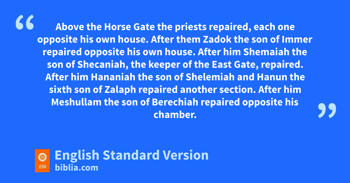 28 Above lthe Horse Gate the priests repaired, each one opposite his own house. 29 After them Zadok the son of Immer repaired opposite his own house. After him Shemaiah the son of Shecaniah, the keeper of the East Gate, repaired. 30 After him Hananiah the son of Shelemiah and Hanun the sixth son of Zalaph repaired another section. After him mMeshullam the son of Berechiah repaired opposite nhis chamber. 31 After him Malchijah, one of the goldsmiths, repaired as far as the house of the temple servants and of the merchants, opposite the Muster Gate,8 and to the upper chamber of the corner. 32 And between the upper chamber of the corner and othe Sheep Gate the goldsmiths and the merchants repaired.