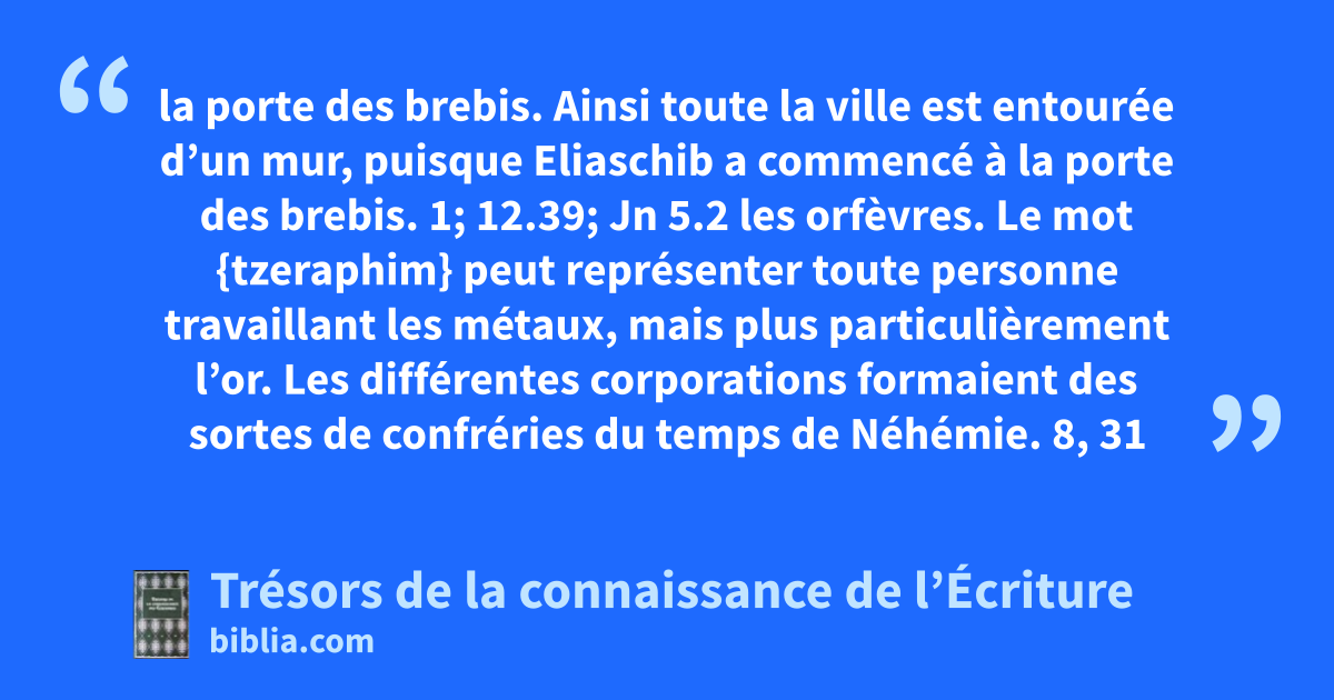 la porte des brebis. Ainsi toute la ville est entourée d’un mur, puisque Eliaschib a commencé à la porte des brebis. 1; 12.39; Jn 5.2 les orfèvres. Le mot {tzeraphim} peut représenter toute personne travaillant les métaux, mais plus particulièrement l’or. Les différentes corporations formaient des sortes de confréries du temps de Néhémie. 8, 31
