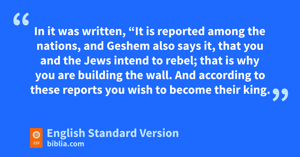 6 Now when aSanballat and Tobiah and bGeshem the Arab and the rest of our enemies heard that I had built the wall and that there was no breach left in it (calthough up to that time I had not set up the doors in the gates), 2 Sanballat and Geshem sent to me, saying, “Come and let us meet together at Hakkephirim in the plain of dOno.” But they intended to do me harm. 3 And I sent messengers to them, saying, “I am doing a great work and I cannot come down. Why should the work stop while I leave it and come down to you?” 4 And they sent to me four times in this way, and I answered them in the same manner. 5 In the same way Sanballat for the fifth time sent his servant to me with an open letter in his hand. 6 In it was written, “It is reported among the nations, and Geshem1 also says it, that you and ethe Jews intend to rebel; that is why you are building the wall. And according to these reports you wish to become their king. 7 And you have also set up prophets to proclaim concerning you in Jerusalem, ‘There is a king in Judah.’ And now the king will hear of these reports. So now come and let us take counsel together.” 8 Then I sent to him, saying, “No such things as you say have been done, for you are inventing them out of your own mind.” 9 For they all wanted to frighten us, thinking, “Their hands will drop from the work, and it will not be done.” But now, O God,2 strengthen my hands.
