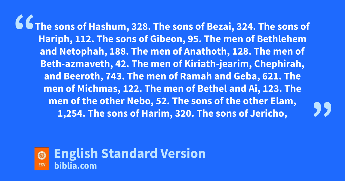 The number of the men of the people of Israel: 8 the sons of Parosh, 2,172. 9 The sons of Shephatiah, 372. 10 The sons of Arah, u652. 11 The sons of Pahath-moab, namely the sons of Jeshua and Joab, 2,818. 12 The sons of vElam, 1,254. 13 The sons of Zattu, 845. 14 The sons of Zaccai, 760. 15 The sons of wBinnui, 648. 16 The sons of Bebai, 628. 17 The sons of Azgad, 2,322. 18 The sons of Adonikam, 667. 19 The sons of Bigvai, 2,067. 20 The sons of Adin, 655. 21 The sons of Ater, namely of Hezekiah, 98. 22 The sons of Hashum, 328. 23 The sons of xBezai, 324. 24 The sons of Hariph, 112. 25 The sons of yGibeon, 95. 26 The men of Bethlehem and Netophah, 188. 27 The men of Anathoth, 128. 28 The men zof Beth-azmaveth, 42. 29 The men of aKiriath-jearim, Chephirah, and Beeroth, 743. 30 The men of Ramah and Geba, 621. 31 The men of Michmas, 122. 32 The men of Bethel and Ai, 123. 33 The men of the other Nebo, 52. 34 The sons of bthe other Elam, 1,254. 35 The sons of Harim, 320. 36 The sons of Jericho, 345. 37 The sons of Lod, Hadid, and Ono, 721. 38 The sons of Senaah, 3,930.