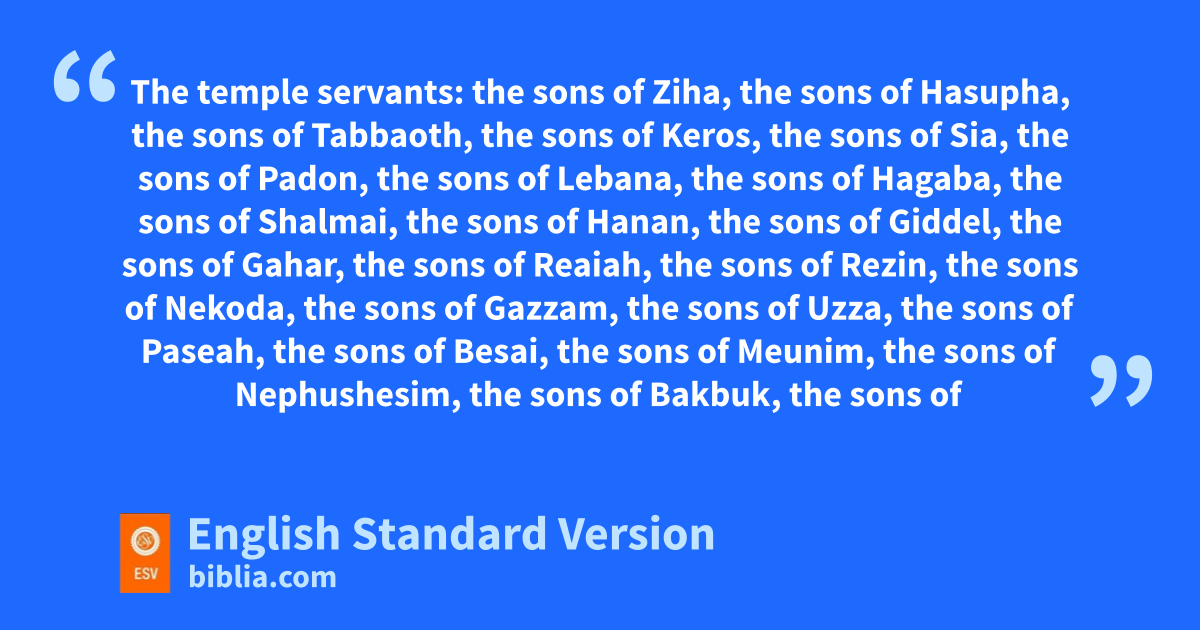 46 The temple servants: the sons of Ziha, the sons of Hasupha, the sons of Tabbaoth, 47 the sons of Keros, the sons of hSia, the sons of Padon, 48 the sons of Lebana, the sons of iHagaba, the sons of iShalmai, 49 the sons of Hanan, the sons of Giddel, the sons of Gahar, 50 the sons of Reaiah, the sons of Rezin, the sons of Nekoda, 51 the sons of Gazzam, the sons of Uzza, the sons of Paseah, 52 the sons of Besai, the sons of Meunim, the sons of jNephushesim, 53 the sons of Bakbuk, the sons of Hakupha, the sons of Harhur, 54 the sons of kBazlith, the sons of Mehida, the sons of Harsha, 55 the sons of Barkos, the sons of Sisera, the sons of Temah, 56 the sons of Neziah, the sons of Hatipha.