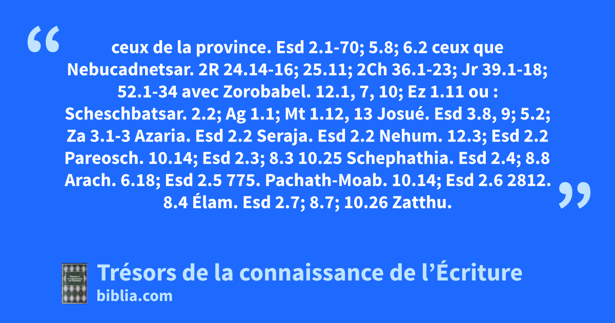 ceux de la province. Esd 2.1-70; 5.8; 6.2 ceux que Nebucadnetsar. 2R 24.14-16; 25.11; 2Ch 36.1-23; Jr 39.1-18; 52.1-34