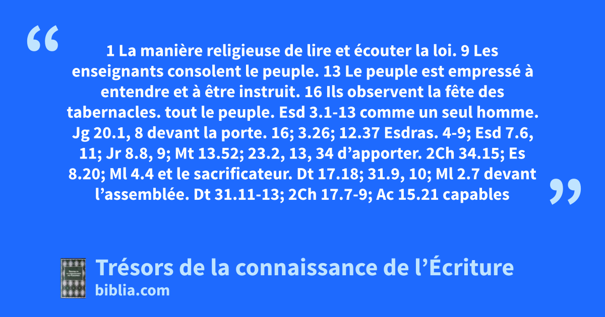 1 La manière religieuse de lire et écouter la loi. 9 Les enseignants consolent le peuple. 13 Le peuple est empressé à entendre et à être instruit. 16 Ils observent la fête des tabernacles.