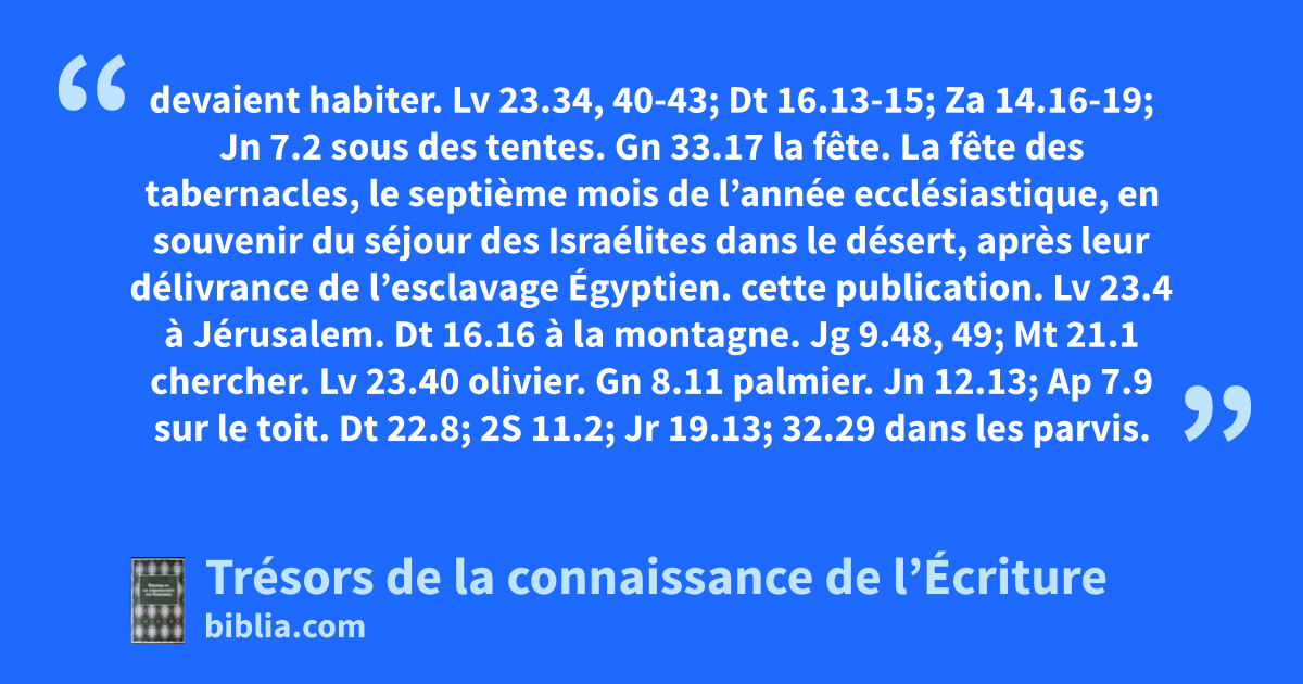 devaient habiter. Lv 23.34, 40-43; Dt 16.13-15; Za 14.16-19; Jn 7.2 sous des tentes. Gn 33.17 la fête. La fête des tabernacles, le septième mois de l’année ecclésiastique, en souvenir du séjour des Israélites dans le désert, après leur délivrance de l’esclavage Égyptien.