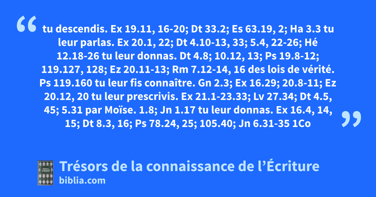 tu descendis. Ex 19.11, 16-20; Dt 33.2; Es 63.19, 2; Ha 3.3 tu leur parlas. Ex 20.1, 22; Dt 4.10-13, 33; 5.4, 22-26; Hé 12.18-26 tu leur donnas. Dt 4.8; 10.12, 13; Ps 19.8-12; 119.127, 128; Ez 20.11-13; Rm 7.12-14, 16 des lois de vérité. Ps 119.160