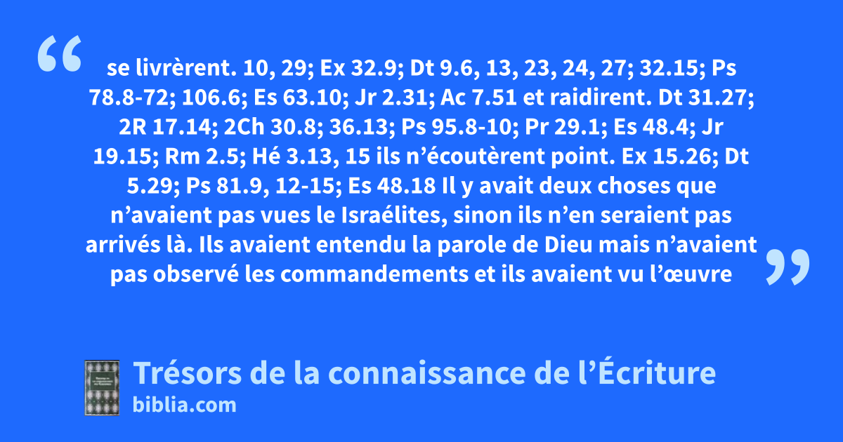 se livrèrent. 10, 29; Ex 32.9; Dt 9.6, 13, 23, 24, 27; 32.15; Ps 78.8-72; 106.6; Es 63.10; Jr 2.31; Ac 7.51 et raidirent. Dt 31.27; 2R 17.14; 2Ch 30.8; 36.13; Ps 95.8-10; Pr 29.1; Es 48.4; Jr 19.15; Rm 2.5; Hé 3.13, 15 ils n’écoutèrent point. Ex 15.26; Dt 5.29; Ps 81.9, 12-15; Es 48.18 Il y avait deux choses que n’avaient pas vues le Israélites, sinon ils n’en seraient pas arrivés là. Ils avaient entendu la parole de Dieu mais n’avaient pas observé les commandements et ils avaient vu l’œuvre de Dieu, mais ne s’étaient pas imprégnés de ses miracles. Sinon ils auraient obéi au principe de la foi et de la crainte sacrée, au principe de la gratitude et du saint amour.