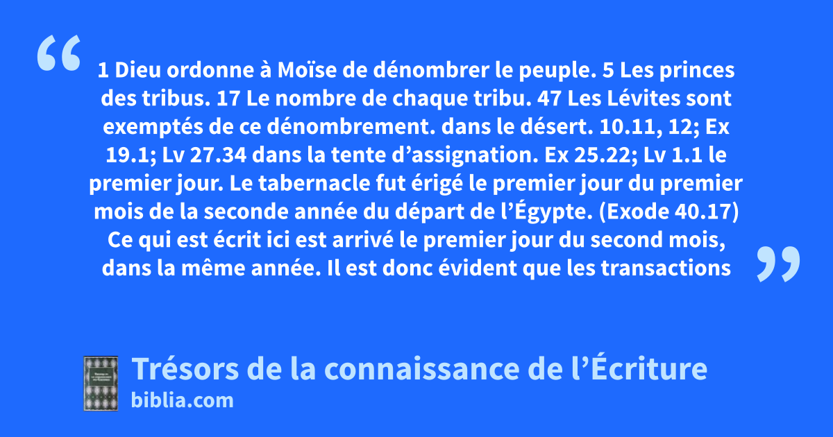 dans le désert. 10.11, 12; Ex 19.1; Lv 27.34 dans la tente d’assignation. Ex 25.22; Lv 1.1 le premier jour. Le tabernacle fut érigé le premier jour du premier mois de la seconde année du départ de l’Égypte. (Exode 40.17) Ce qui est écrit ici est arrivé le premier jour du second mois, dans la même année. Il est donc évident que les transactions relatées dans le livre précédent ont été mises en place sur une durée de un mois, et pendant ce temps les Israélites ont campé au Mont Sinaï. 9.1; 10.11; Ex 40.17; 1R 6.1