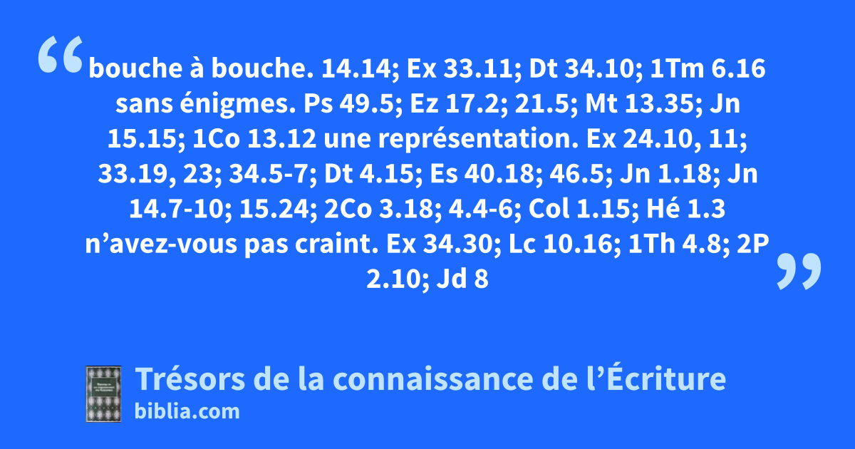 bouche à bouche. 14.14; Ex 33.11; Dt 34.10; 1Tm 6.16 sans énigmes. Ps 49.5; Ez 17.2; 21.5; Mt 13.35; Jn 15.15; 1Co 13.12 une représentation. Ex 24.10, 11; 33.19, 23; 34.5-7; Dt 4.15; Es 40.18; 46.5; Jn 1.18; Jn 14.7-10; 15.24; 2Co 3.18; 4.4-6; Col 1.15; Hé 1.3 n’avez-vous pas craint. Ex 34.30; Lc 10.16; 1Th 4.8; 2P 2.10; Jd 8