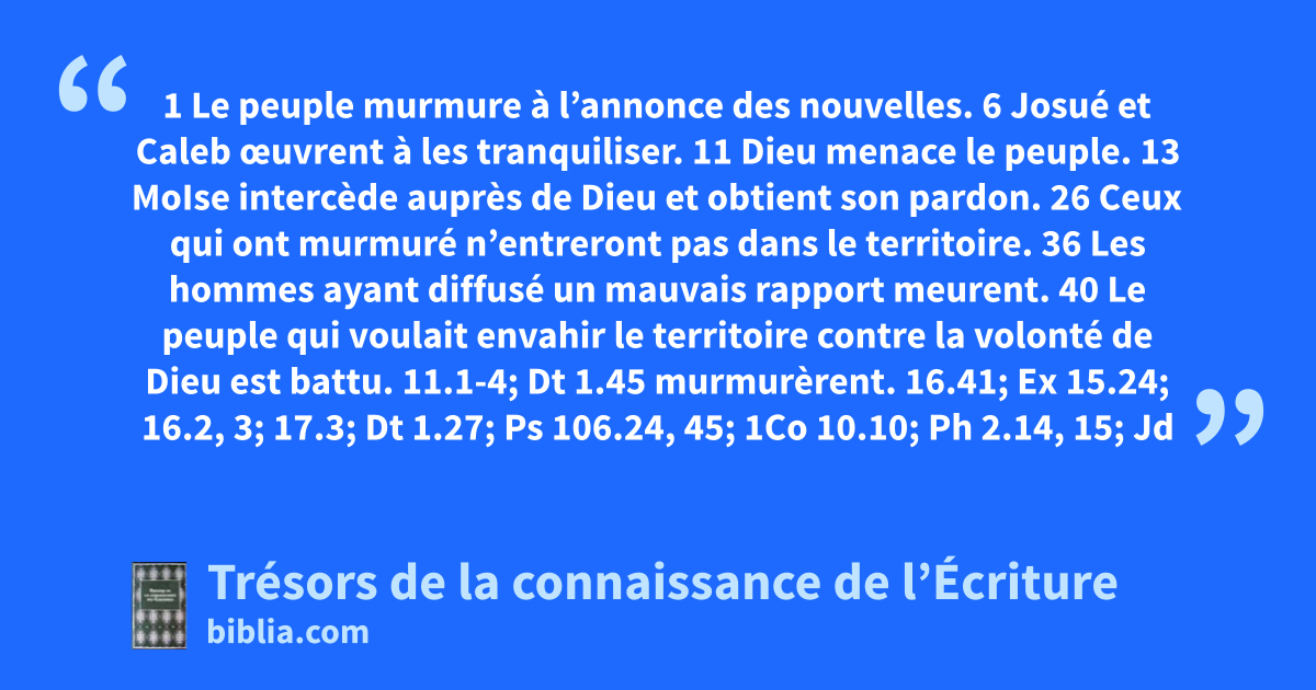 1 Le peuple murmure à l’annonce des nouvelles. 6 Josué et Caleb œuvrent à les tranquiliser. 11 Dieu menace le peuple. 13 MoIse intercède auprès de Dieu et obtient son pardon. 26 Ceux qui ont murmuré n’entreront pas dans le territoire. 36 Les hommes ayant diffusé un mauvais rapport meurent. 40 Le peuple qui voulait envahir le territoire contre la volonté de Dieu est battu.