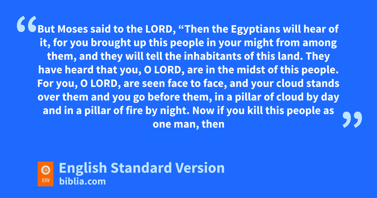 13 But bMoses said to the Lord, “Then the Egyptians will hear of it, for you brought up this people in your might from among them, 14 and they will tell the inhabitants of this land. cThey have heard that you, O Lord, are in the midst of this people. For you, O Lord, are seen face to face, and dyour cloud stands over them and you go before them, in a pillar of cloud by day and in a pillar of fire by night. 15 Now if you kill this people as one man, then the nations who have heard your fame will say, 16 ‘It is because the Lord ewas not able to bring this people into the land that he swore to give to them that he has killed them in the wilderness.’ 17 And now, please let the power of the Lord be great as you have promised, saying, 18 f‘The Lord is slow to anger and abounding in steadfast love, forgiving iniquity and transgression, but he will by no means clear the guilty, gvisiting the iniquity of the fathers on the children, to the third and the fourth generation.’ 19 Please hpardon the iniquity of this people, according to the greatness of your steadfast love, just ias you have forgiven this people, from Egypt until now.”