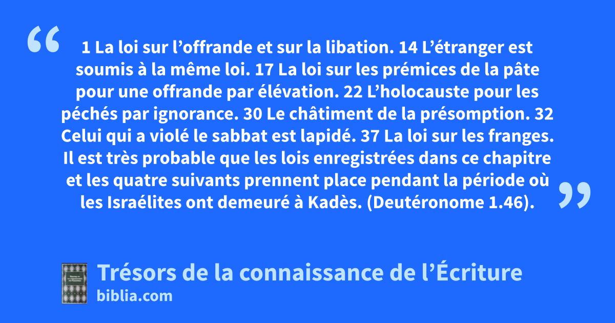 1 La loi sur l’offrande et sur la libation. 14 L’étranger est soumis à la même loi. 17 La loi sur les prémices de la pâte pour une offrande par élévation. 22 L’holocauste pour les péchés par ignorance. 30 Le châtiment de la présomption. 32 Celui qui a violé le sabbat est lapidé. 37 La loi sur les franges.