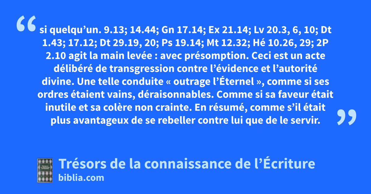 si quelqu’un. 9.13; 14.44; Gn 17.14; Ex 21.14; Lv 20.3, 6, 10; Dt 1.43; 17.12; Dt 29.19, 20; Ps 19.14; Mt 12.32; Hé 10.26, 29; 2P 2.10 agit la main levée : avec présomption. Ceci est un acte délibéré de transgression contre l’évidence et l’autorité divine. Une telle conduite « outrage l’Éternel », comme si ses ordres étaient vains, déraisonnables. Comme si sa faveur était inutile et sa colère non crainte. En résumé, comme s’il était plus avantageux de se rebeller contre lui que de le servir. De tels actes n’admettaient pas l’expiation, la personne qui en était coupable devait porter sa propre iniquité, être retranchée du milieu du peuple. il outrage. Ps 69.10; 74.18, 22; 79.12; 89.52; Pr 14.31; Es 37.23, 24