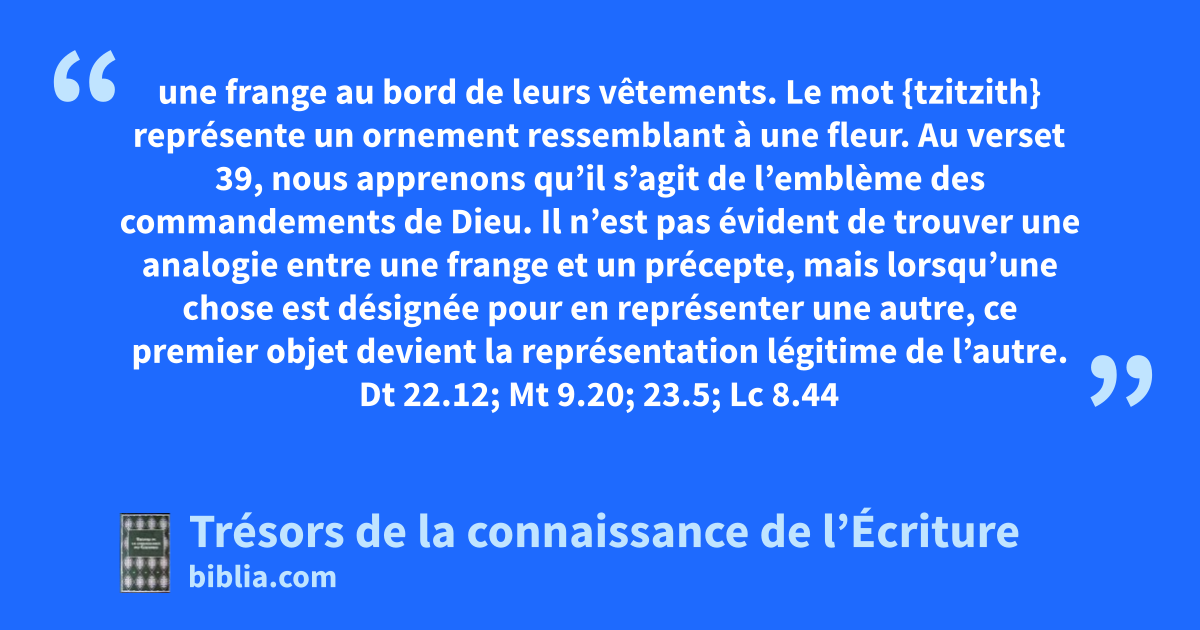 une frange au bord de leurs vêtements. Le mot {tzitzith} représente un ornement ressemblant à une fleur. Au verset 39, nous apprenons qu’il s’agit de l’emblème des commandements de Dieu. Il n’est pas évident de trouver une analogie entre une frange et un précepte, mais lorsqu’une chose est désignée pour en représenter une autre, ce premier objet devient la représentation légitime de l’autre. Dt 22.12; Mt 9.20; 23.5; Lc 8.44