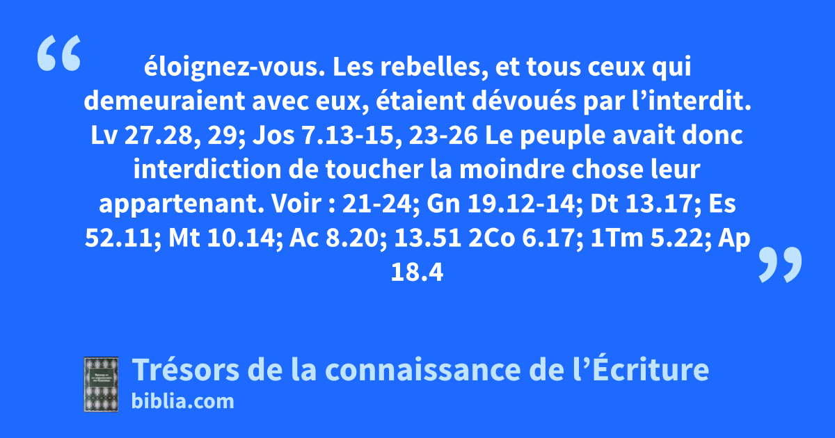 éloignez-vous. Les rebelles, et tous ceux qui demeuraient avec eux, étaient dévoués par l’interdit. Lv 27.28, 29; Jos 7.13-15, 23-26 Le peuple avait donc interdiction de toucher la moindre chose leur appartenant. Voir : 21-24; Gn 19.12-14; Dt 13.17; Es 52.11; Mt 10.14; Ac 8.20; 13.51 2Co 6.17; 1Tm 5.22; Ap 18.4