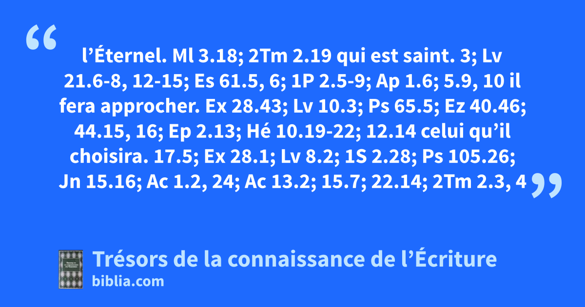l’Éternel. Ml 3.18; 2Tm 2.19 qui est saint. 3; Lv 21.6-8, 12-15; Es 61.5, 6; 1P 2.5-9; Ap 1.6; 5.9, 10 il fera approcher. Ex 28.43; Lv 10.3; Ps 65.5; Ez 40.46; 44.15, 16; Ep 2.13; Hé 10.19-22; 12.14 celui qu’il choisira. 17.5; Ex 28.1; Lv 8.2; 1S 2.28; Ps 105.26; Jn 15.16; Ac 1.2, 24; Ac 13.2; 15.7; 22.14; 2Tm 2.3, 4