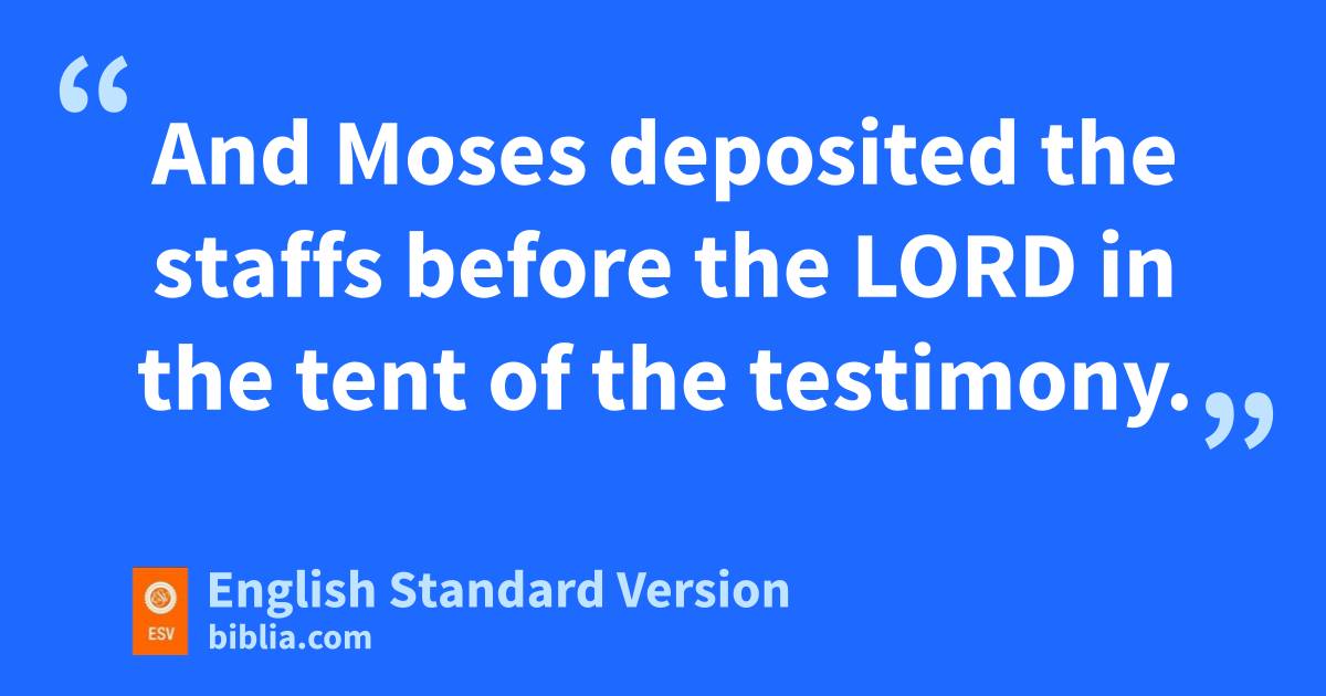 17 1 The Lord spoke to Moses, saying, 2 h“Speak to the people of Israel, and get from them staffs, one for each fathers’ house, from all their chiefs according to their fathers’ houses, twelve staffs. Write each man’s name on his staff, 3 and write Aaron’s name on the staff of Levi. For there shall be one staff for the head of each fathers’ house. 4 Then you shall deposit them in the tent of meeting before the testimony, iwhere I meet with you. 5 And the staff of the man jwhom I choose shall sprout. Thus I will make to cease from me kthe grumblings of the people of Israel, which they grumble against you.” 6 Moses spoke to the people of Israel. And all their chiefs gave him staffs, one for each chief, according to their fathers’ houses, twelve staffs. And the staff of Aaron was among their staffs. 7 And Moses deposited the staffs before the Lord in lthe tent of the testimony.