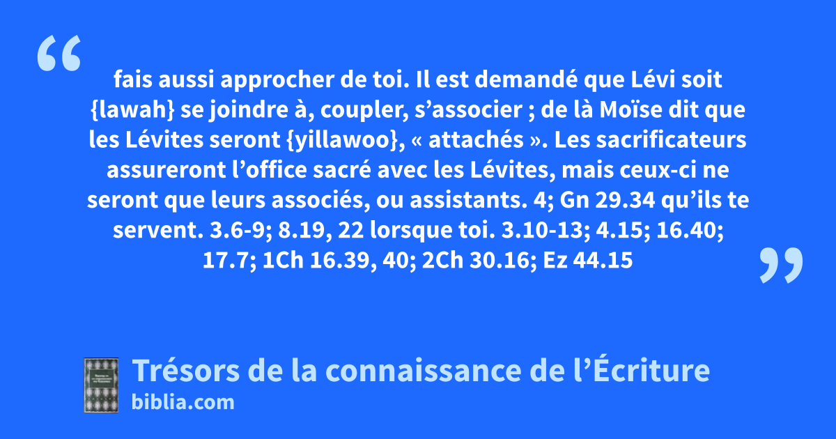 fais aussi approcher de toi. Il est demandé que Lévi soit {lawah} se joindre à, coupler, s’associer ; de là Moïse dit que les Lévites seront {yillawoo}, « attachés ». Les sacrificateurs assureront l’office sacré avec les Lévites, mais ceux-ci ne seront que leurs associés, ou assistants. 4; Gn 29.34 qu’ils te servent. 3.6-9; 8.19, 22 lorsque toi. 3.10-13; 4.15; 16.40; 17.7; 1Ch 16.39, 40; 2Ch 30.16; Ez 44.15