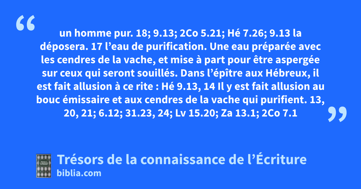 un homme pur. 18; 9.13; 2Co 5.21; Hé 7.26; 9.13 la déposera. 17 l’eau de purification. Une eau préparée avec les cendres de la vache, et mise à part pour être aspergée sur ceux qui seront souillés. Dans l’épître aux Hébreux, il est fait allusion à ce rite : Hé 9.13, 14 Il y est fait allusion au bouc émissaire et aux cendres de la vache qui purifient. 13, 20, 21; 6.12; 31.23, 24; Lv 15.20; Za 13.1; 2Co 7.1
