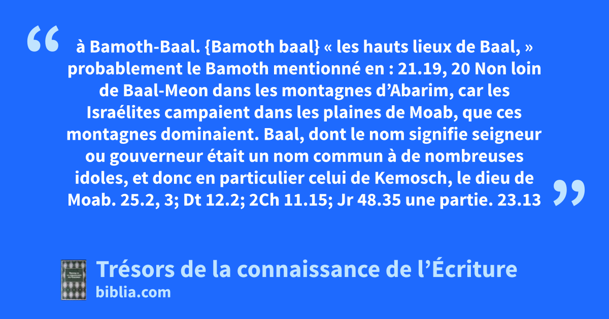à Bamoth-Baal. {Bamoth baal} « les hauts lieux de Baal, » probablement le Bamoth mentionné en : 21.19, 20 Non loin de Baal-Meon dans les montagnes d’Abarim, car les Israélites campaient dans les plaines de Moab, que ces montagnes dominaient. Baal, dont le nom signifie seigneur ou gouverneur était un nom commun à de nombreuses idoles, et donc en particulier celui de Kemosch, le dieu de Moab. 25.2, 3; Dt 12.2; 2Ch 11.15; Jr 48.35 une partie. 23.13