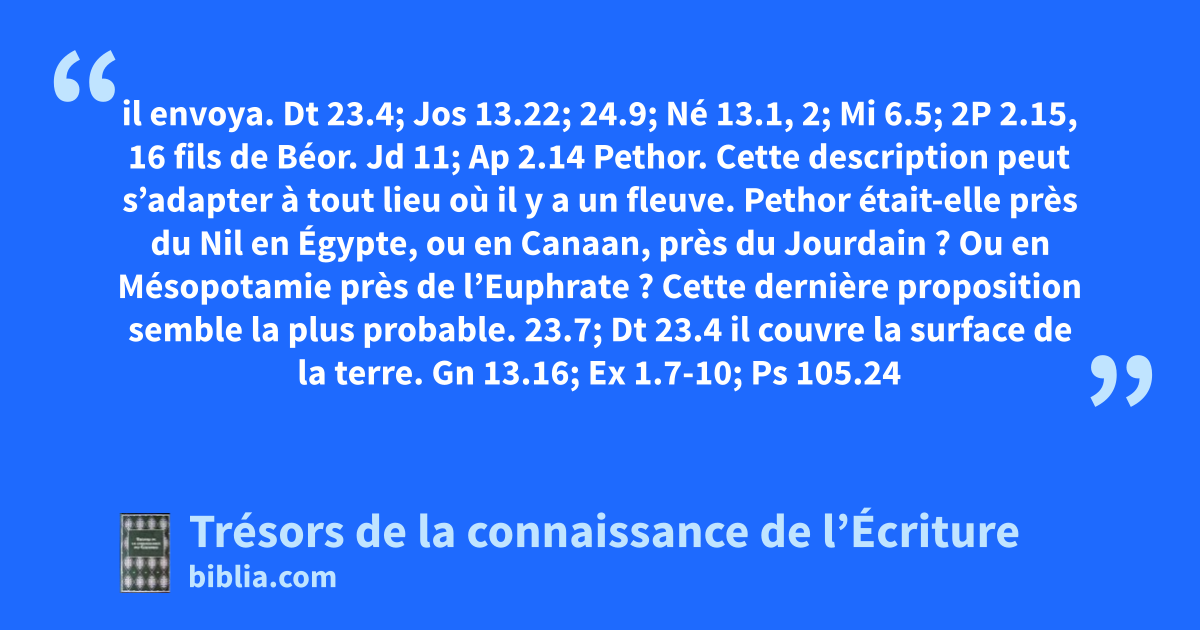 il envoya. Dt 23.4; Jos 13.22; 24.9; Né 13.1, 2; Mi 6.5; 2P 2.15, 16 fils de Béor. Jd 11; Ap 2.14 Pethor. Cette description peut s’adapter à tout lieu où il y a un fleuve. Pethor était-elle près du Nil en Égypte, ou en Canaan, près du Jourdain ? Ou en Mésopotamie près de l’Euphrate ? Cette dernière proposition semble la plus probable. 23.7; Dt 23.4 il couvre la surface de la terre. Gn 13.16; Ex 1.7-10; Ps 105.24