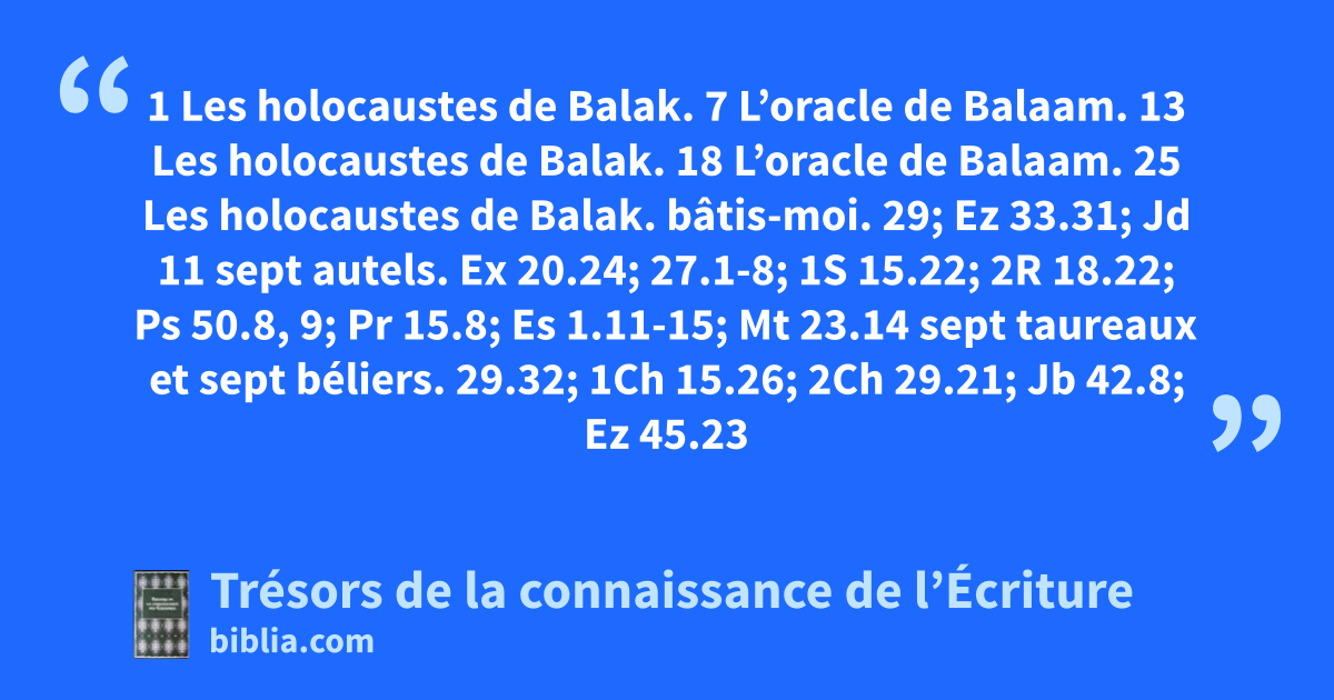bâtis-moi. 29; Ez 33.31; Jd 11 sept autels. Ex 20.24; 27.1-8; 1S 15.22; 2R 18.22; Ps 50.8, 9; Pr 15.8; Es 1.11-15; Mt 23.14 sept taureaux et sept béliers. 29.32; 1Ch 15.26; 2Ch 29.21; Jb 42.8; Ez 45.23