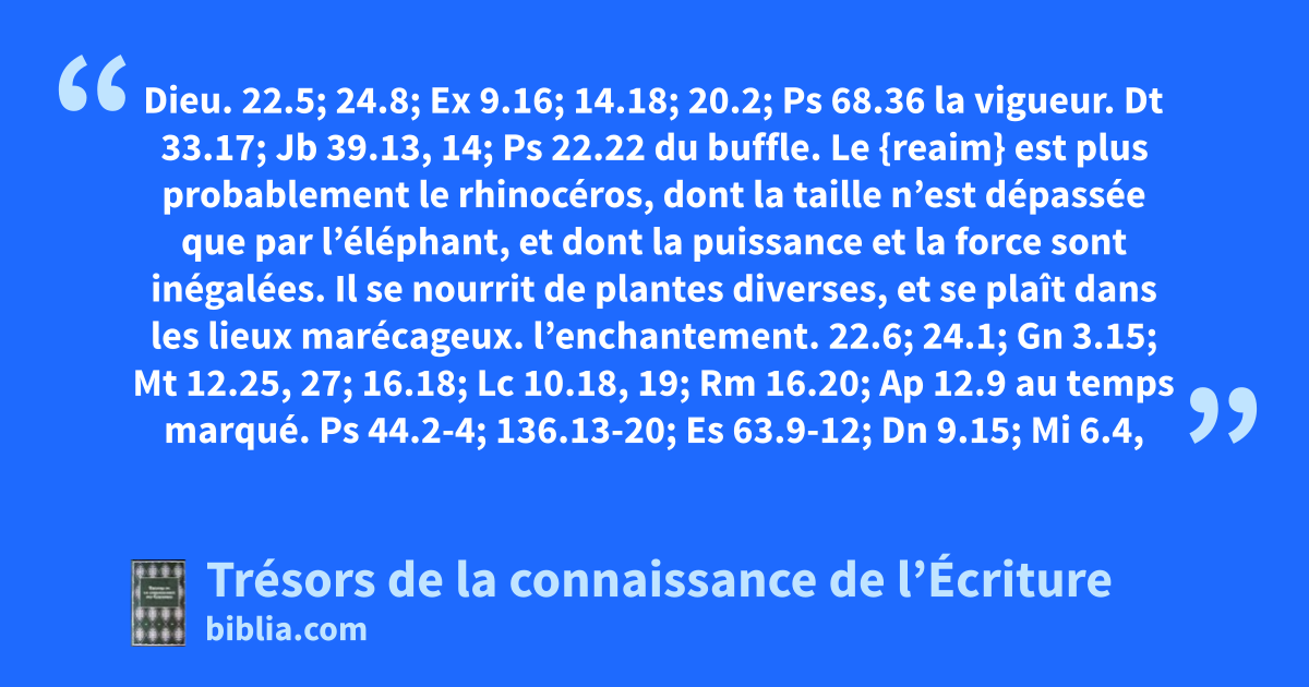 Dieu. 22.5; 24.8; Ex 9.16; 14.18; 20.2; Ps 68.36 la vigueur. Dt 33.17; Jb 39.13, 14; Ps 22.22 du buffle. Le {reaim} est plus probablement le rhinocéros, dont la taille n’est dépassée que par l’éléphant, et dont la puissance et la force sont inégalées. Il se nourrit de plantes diverses, et se plaît dans les lieux marécageux.