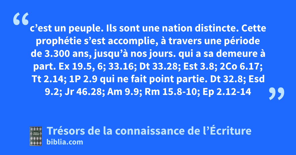 c’est un peuple. Ils sont une nation distincte. Cette prophétie s’est accomplie, à travers une période de 3.300 ans, jusqu’à nos jours. qui a sa demeure à part. Ex 19.5, 6; 33.16; Dt 33.28; Est 3.8; 2Co 6.17; Tt 2.14; 1P 2.9 qui ne fait point partie. Dt 32.8; Esd 9.2; Jr 46.28; Am 9.9; Rm 15.8-10; Ep 2.12-14