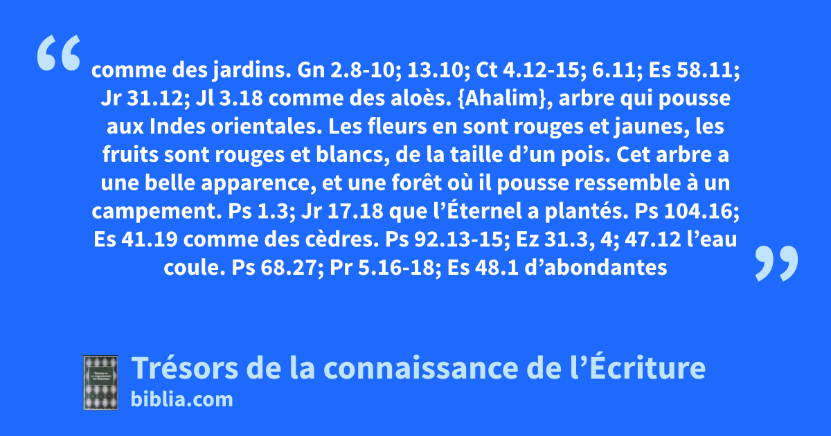 comme des jardins. Gn 2.8-10; 13.10; Ct 4.12-15; 6.11; Es 58.11; Jr 31.12; Jl 3.18 comme des aloès. {Ahalim}, arbre qui pousse aux Indes orientales. Les fleurs en sont rouges et jaunes, les fruits sont rouges et blancs, de la taille d’un pois. Cet arbre a une belle apparence, et une forêt où il pousse ressemble à un campement. Ps 1.3; Jr 17.18 que l’Éternel a plantés. Ps 104.16; Es 41.19 comme des cèdres. Ps 92.13-15; Ez 31.3, 4; 47.12
