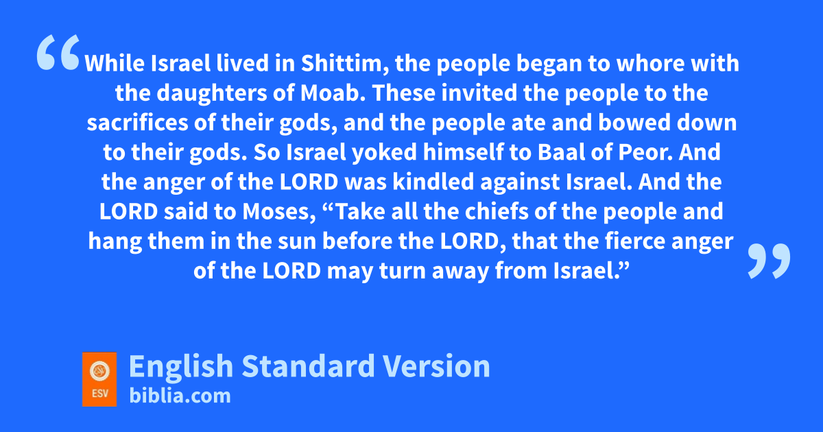 25 While Israel lived in eShittim, fthe people began to whore with the daughters of Moab. 2 gThese invited the people to the sacrifices of their gods, and the people ate and bowed down to their gods. 3 So Israel yoked himself to Baal of Peor. And the anger of the Lord was kindled against Israel. 4 And the Lord said to Moses, h“Take all the chiefs of the people and ihang1 them in the sun before the Lord, jthat the fierce anger of the Lord may turn away from Israel.” 5 And Moses said to kthe judges of Israel, l“Each of you kill those of his men who have yoked themselves to Baal of Peor.”