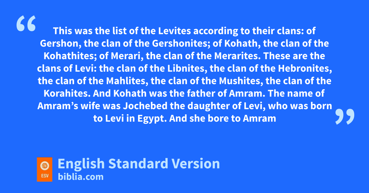 57 mThis was the list of the Levites according to their clans: of Gershon, the clan of the Gershonites; of Kohath, the clan of the Kohathites; of Merari, the clan of the Merarites. 58 These are the clans of Levi: the clan of the Libnites, the clan of the Hebronites, the clan of the Mahlites, the clan of the Mushites, the clan of the Korahites. And Kohath was the father of Amram. 59 The name of Amram’s wife was nJochebed the daughter of Levi, who was born to Levi in Egypt. And she bore to Amram Aaron and Moses and Miriam their sister. 60 oAnd to Aaron were born Nadab, Abihu, Eleazar, and Ithamar. 61 pBut Nadab and Abihu died when they offered unauthorized fire before the Lord. 62 And those listed were q23,000, every male from a month old and upward. For rthey were not listed among the people of Israel, because sthere was no inheritance given to them among the people of Israel.