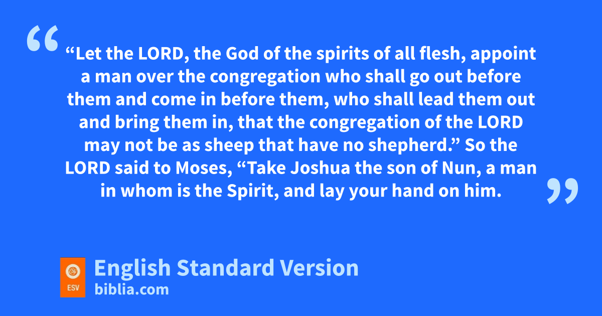 12 The Lord said to Moses, “Go up into hthis mountain of Abarim and see the land that I have given to the people of Israel. 13 When you have seen it, you also ishall be gathered to your people, as your brother Aaron was, 14 jbecause you rebelled against my word in the wilderness of Zin when the congregation quarreled, failing kto uphold me as holy at the waters before their eyes.” (These are lthe waters of Meribah of Kadesh in the wilderness of Zin.) 15 Moses spoke to the Lord, saying, 16 “Let the Lord, mthe God of the spirits of all flesh, appoint a man over the congregation 17 who nshall go out before them and come in before them, who shall lead them out and bring them in, that the congregation of the Lord may not be oas sheep that have no shepherd.” 18 So the Lord said to Moses, “Take pJoshua the son of Nun, a man qin whom is the Spirit, and rlay your hand on him. 19 Make him stand before Eleazar the priest and all the congregation, and you shall scommission him in their sight. 20 You shall invest him with some of your authority, tthat all the congregation of the people of Israel may obey. 21 And he shall stand before Eleazar the priest, who shall inquire for him uby the judgment of the Urim before the Lord. At his word they shall go out, and at his word they shall come in, both he and all the people of Israel with him, the whole congregation.” 22 And Moses did as the Lord commanded him. He took Joshua and made him stand before Eleazar the priest and the whole congregation, 23 and he laid his hands on him and scommissioned him as the Lord directed through Moses.