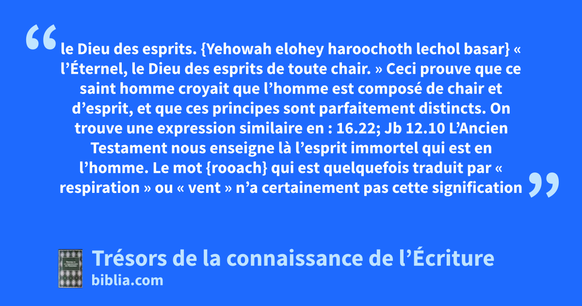 le Dieu des esprits. {Yehowah elohey haroochoth lechol basar} « l’Éternel, le Dieu des esprits de toute chair. » Ceci prouve que ce saint homme croyait que l’homme est composé de chair et d’esprit, et que ces principes sont parfaitement distincts. On trouve une expression similaire en : 16.22; Jb 12.10 L’Ancien Testament nous enseigne là l’esprit immortel qui est en l’homme. Le mot {rooach} qui est quelquefois traduit par « respiration » ou « vent » n’a certainement pas cette signification ici et dans les passages cités. le Dieu. 16.22; Hé 12.9 établisse sur l’assemblée un homme. Dt 31.14; 1S 12.13; 1R 5.5; Jr 3.15; 23.4, 5; Ez 34.11-16, 23; Ez 37.24; Mt 9.38; Jn 10.11; Ac 20.28; 1P 5.2-4