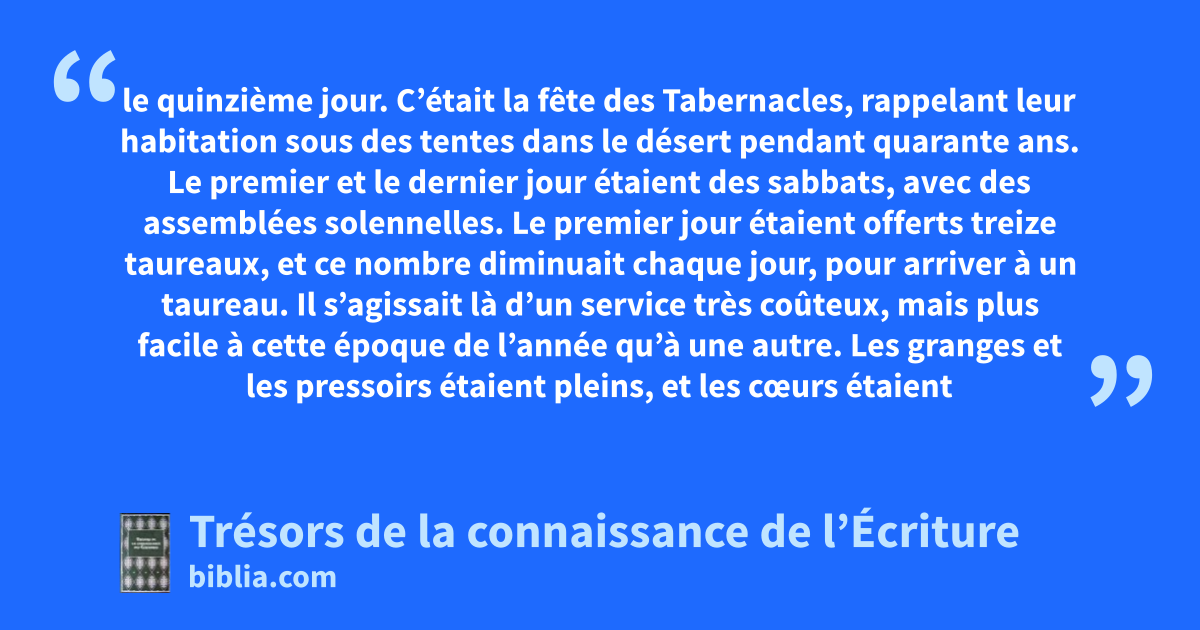 le quinzième jour. C’était la fête des Tabernacles, rappelant leur habitation sous des tentes dans le désert pendant quarante ans. Le premier et le dernier jour étaient des sabbats, avec des assemblées solennelles. Le premier jour étaient offerts treize taureaux, et ce nombre diminuait chaque jour, pour arriver à un taureau. Il s’agissait là d’un service très coûteux, mais plus facile à cette époque de l’année qu’à une autre. Les granges et les pressoirs étaient pleins, et les cœurs étaient supposés plus ouverts qu’à d’autres moments. Ex 23.16; 34.22; Lv 23.33-43; Dt 16.13, 14; Né 8.14, 18; Ez 45.25; Za 14.16-19; Jn 1.14; Hé 11.9-13