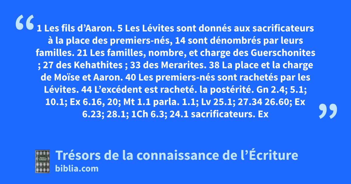 1 Les fils d’Aaron. 5 Les Lévites sont donnés aux sacrificateurs à la place des premiers-nés, 14 sont dénombrés par leurs familles. 21 Les familles, nombre, et charge des Guerschonites ; 27 des Kehathites ; 33 des Merarites. 38 La place et la charge de Moïse et Aaron. 40 Les premiers-nés sont rachetés par les Lévites. 44 L’excédent est racheté.