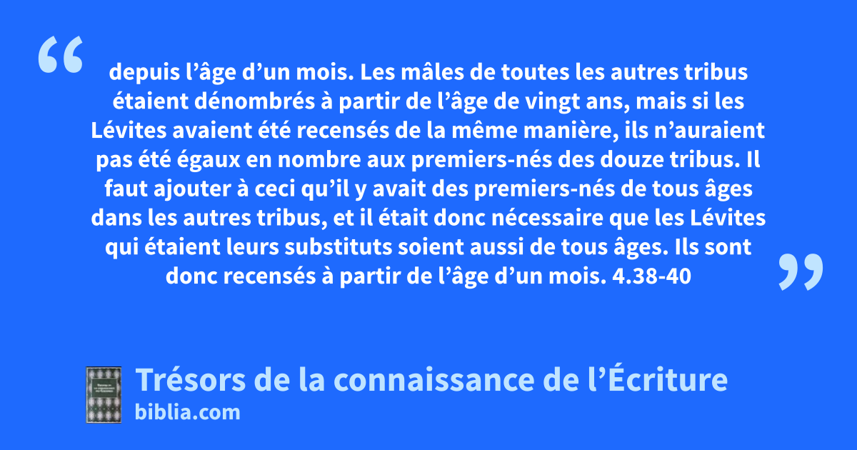 depuis l’âge d’un mois. Les mâles de toutes les autres tribus étaient dénombrés à partir de l’âge de vingt ans, mais si les Lévites avaient été recensés de la même manière, ils n’auraient pas été égaux en nombre aux premiers-nés des douze tribus. Il faut ajouter à ceci qu’il y avait des premiers-nés de tous âges dans les autres tribus, et il était donc nécessaire que les Lévites qui étaient leurs substituts soient aussi de tous âges. Ils sont donc recensés à partir de l’âge d’un mois. 4.38-40
