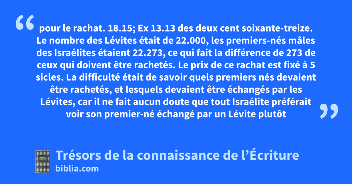 pour le rachat. 18.15; Ex 13.13 des deux cent soixante-treize. Le nombre des Lévites était de 22.000, les premiers-nés mâles des Israélites étaient 22.273, ce qui fait la différence de 273 de ceux qui doivent être rachetés. Le prix de ce rachat est fixé à 5 sicles. La difficulté était de savoir quels premiers nés devaient être rachetés, et lesquels devaient être échangés par les Lévites, car il ne fait aucun doute que tout Israélite préférait voir son premier-né échangé par un Lévite plutôt que de payer cinq sicles du sanctuaire. Peut-être a-t-il été procédé à un tirage au sort. Il est fait référence à ce type de rachat des hommes dans la 1ère épître de Pierre. 1P 1.18, 19 qui dépassent. 39, 43