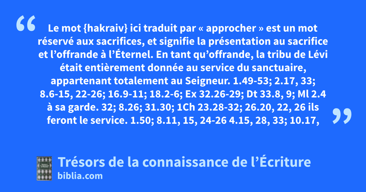 Le mot {hakraiv} ici traduit par « approcher » est un mot réservé aux sacrifices, et signifie la présentation au sacrifice et l’offrande à l’Éternel. En tant qu’offrande, la tribu de Lévi était entièrement donnée au service du sanctuaire, appartenant totalement au Seigneur. 1.49-53; 2.17, 33; 8.6-15, 22-26; 16.9-11; 18.2-6; Ex 32.26-29; Dt 33.8, 9; Ml 2.4