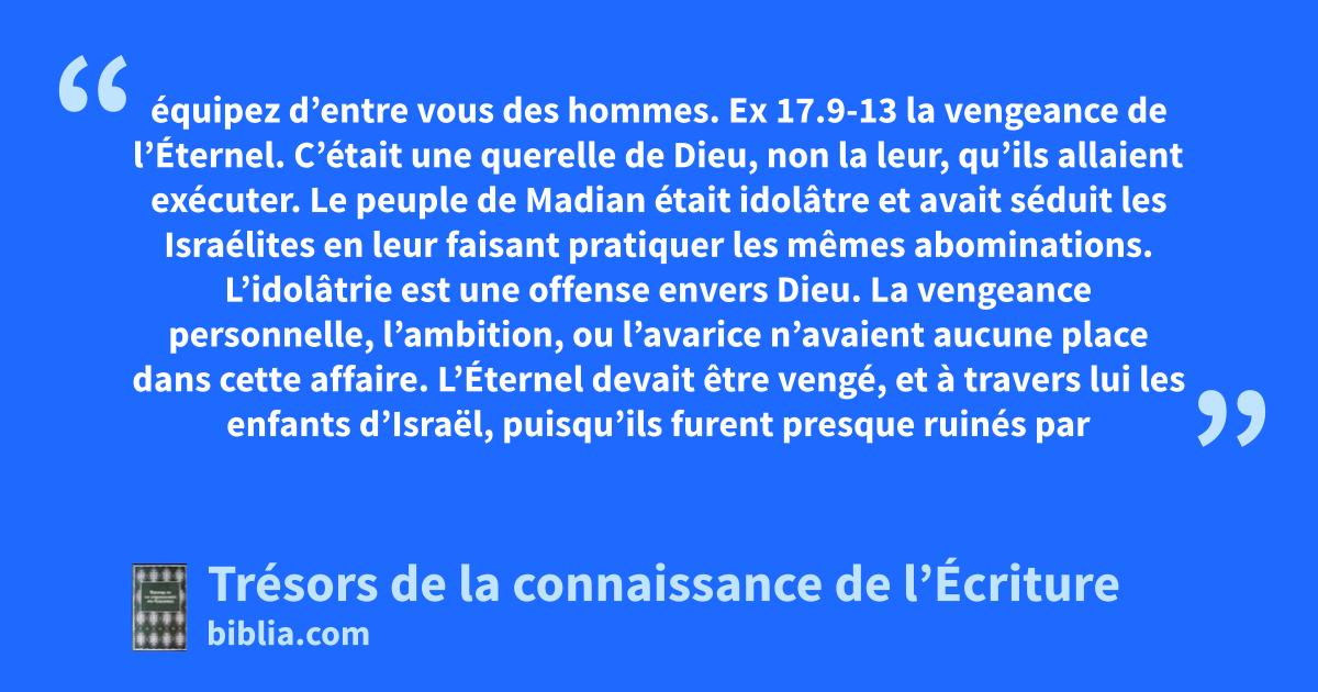 équipez d’entre vous des hommes. Ex 17.9-13 la vengeance de l’Éternel. C’était une querelle de Dieu, non la leur, qu’ils allaient exécuter. Le peuple de Madian était idolâtre et avait séduit les Israélites en leur faisant pratiquer les mêmes abominations. L’idolâtrie est une offense envers Dieu. La vengeance personnelle, l’ambition, ou l’avarice n’avaient aucune place dans cette affaire. L’Éternel devait être vengé, et à travers lui les enfants d’Israël, puisqu’ils furent presque ruinés par leur idolâtrie. Il peut convenir à l’Éternel de commander à une personne ou à un peuple de venger sa cause, mais cela ne sanctifie pas les guerres, massacres ou dévastations. Il faut bien observer qu’en critiquant Dieu pour son action, on peut montrer son inimitié envers lui, en devenant les avocats de ses ennemis. 25.11, 13; Ex 17.16; Lv 26.25; Jg 5.2, 23; 2R 9.7; 10.30; Jr 46.10; Jr 50.28