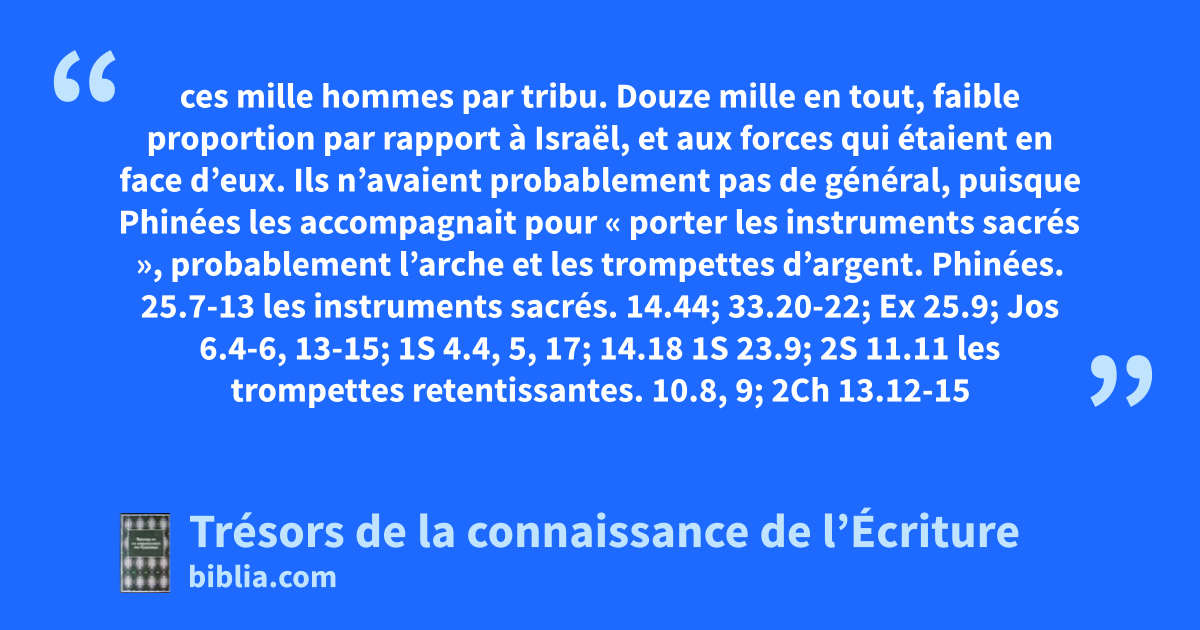 ces mille hommes par tribu. Douze mille en tout, faible proportion par rapport à Israël, et aux forces qui étaient en face d’eux. Ils n’avaient probablement pas de général, puisque Phinées les accompagnait pour « porter les instruments sacrés », probablement l’arche et les trompettes d’argent. Phinées. 25.7-13 les instruments sacrés. 14.44; 33.20-22; Ex 25.9; Jos 6.4-6, 13-15; 1S 4.4, 5, 17; 14.18 1S 23.9; 2S 11.11 les trompettes retentissantes. 10.8, 9; 2Ch 13.12-15
