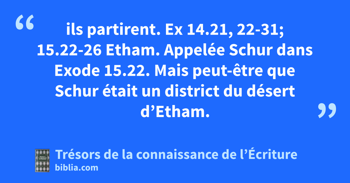 ils partirent. Ex 14.21, 22-31; 15.22-26 Etham. Appelée Schur dans Exode 15.22. Mais peut-être que Schur était un district du désert d’Etham.