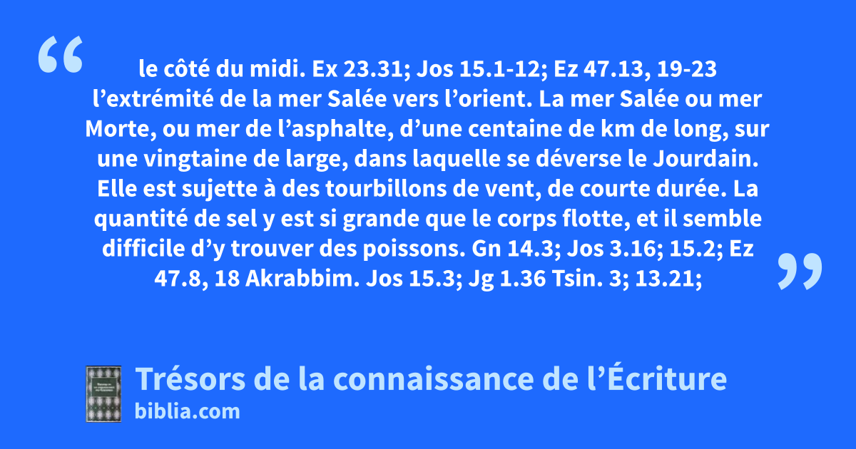 le côté du midi. Ex 23.31; Jos 15.1-12; Ez 47.13, 19-23 l’extrémité de la mer Salée vers l’orient. La mer Salée ou mer Morte, ou mer de l’asphalte, d’une centaine de km de long, sur une vingtaine de large, dans laquelle se déverse le Jourdain. Elle est sujette à des tourbillons de vent, de courte durée. La quantité de sel y est si grande que le corps flotte, et il semble difficile d’y trouver des poissons. Gn 14.3; Jos 3.16; 15.2; Ez 47.8, 18