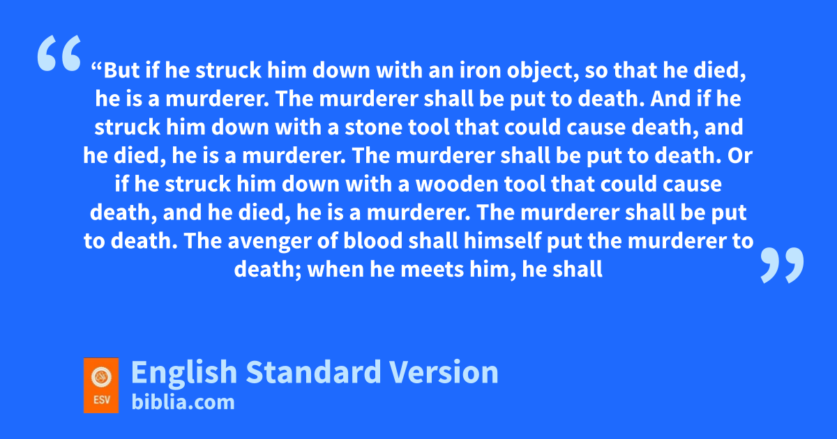 16 d“But if he struck him down with an iron object, so that he died, he is a murderer. The murderer shall be put to death. 17 And if he struck him down with a stone tool that could cause death, and he died, he is a murderer. The murderer shall be put to death. 18 Or if he struck him down with a wooden tool that could cause death, and he died, he is a murderer. The murderer shall be put to death. 19 eThe avenger of blood shall himself put the murderer to death; when he meets him, he shall put him to death. 20 And if he pushed him out of hatred or hurled something at him, flying in wait, so that he died, 21 or in enmity struck him down with his hand, so that he died, then he who struck the blow shall be put to death. He is a murderer. eThe avenger of blood shall put the murderer to death when he meets him.