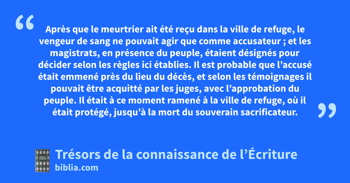 Après que le meurtrier ait été reçu dans la ville de refuge, le vengeur de sang ne pouvait agir que comme accusateur ; et les magistrats, en présence du peuple, étaient désignés pour décider selon les règles ici établies. Il est probable que l’accusé était emmené près du lieu du décès, et selon les témoignages il pouvait être acquitté par les juges, avec l’approbation du peuple. Il était à ce moment ramené à la ville de refuge, où il était protégé, jusqu’à la mort du souverain sacrificateur. Cela permettait aux ressentiments de s’estomper. Mais par contre, s’il quittait la ville, et était tué par le vengeur du sang, il était supposé mériter sa peine, en ayant négligé la protection offerte par Dieu. 26