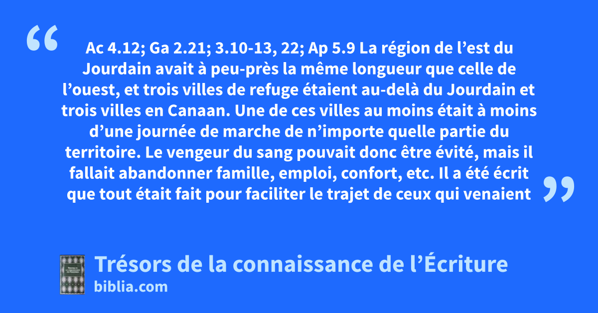 Ac 4.12; Ga 2.21; 3.10-13, 22; Ap 5.9 La région de l’est du Jourdain avait à peu-près la même longueur que celle de l’ouest, et trois villes de refuge étaient au-delà du Jourdain et trois villes en Canaan. Une de ces villes au moins était à moins d’une journée de marche de n’importe quelle partie du territoire. Le vengeur du sang pouvait donc être évité, mais il fallait abandonner famille, emploi, confort, etc. Il a été écrit que tout était fait pour faciliter le trajet de ceux qui venaient se réfugier : les routes de ces villes étaient maintenues en bon état, des panneaux indicateurs étaient placés pour que celui qui fuyait n’ait pas à hésiter un seul instant.