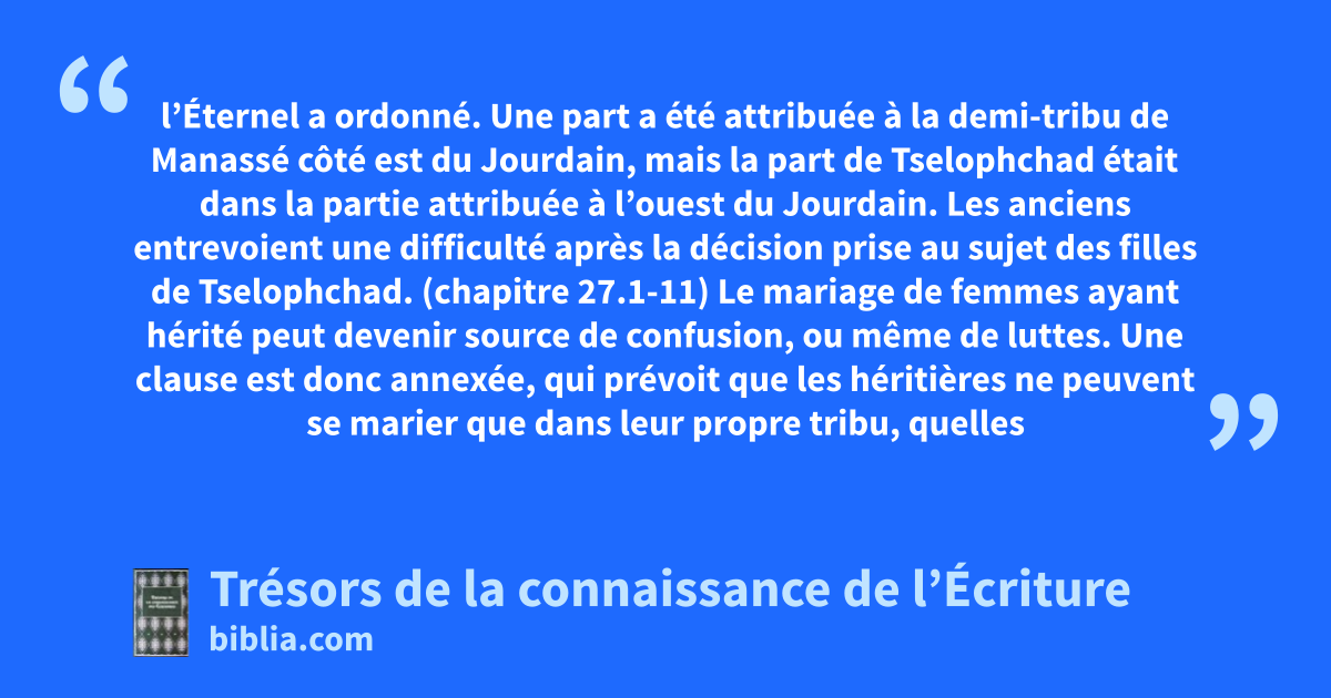l’Éternel a ordonné. Une part a été attribuée à la demi-tribu de Manassé côté est du Jourdain, mais la part de Tselophchad était dans la partie attribuée à l’ouest du Jourdain. Les anciens entrevoient une difficulté après la décision prise au sujet des filles de Tselophchad. (chapitre 27.1-11) Le mariage de femmes ayant hérité peut devenir source de confusion, ou même de luttes. Une clause est donc annexée, qui prévoit que les héritières ne peuvent se marier que dans leur propre tribu, quelles que soient leurs inclinations. 26.55, 56; 27.1-7; 33.54; Jos 13.6; 14.1, 2; 17.3 de donner le pays. 27.1, 7; Jos 17.3-6; Jb 42.15