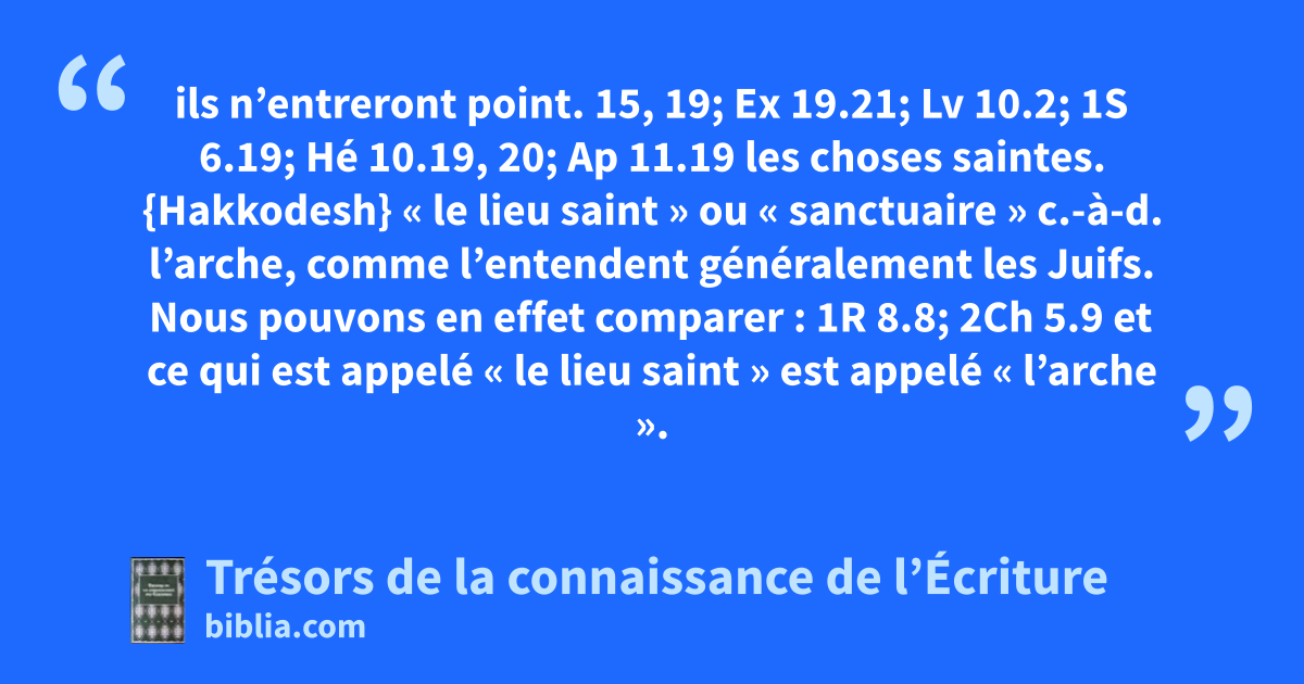 ils n’entreront point. 15, 19; Ex 19.21; Lv 10.2; 1S 6.19; Hé 10.19, 20; Ap 11.19 les choses saintes. {Hakkodesh} « le lieu saint » ou « sanctuaire » c.-à-d. l’arche, comme l’entendent généralement les Juifs. Nous pouvons en effet comparer : 1R 8.8; 2Ch 5.9 et ce qui est appelé « le lieu saint » est appelé « l’arche ».