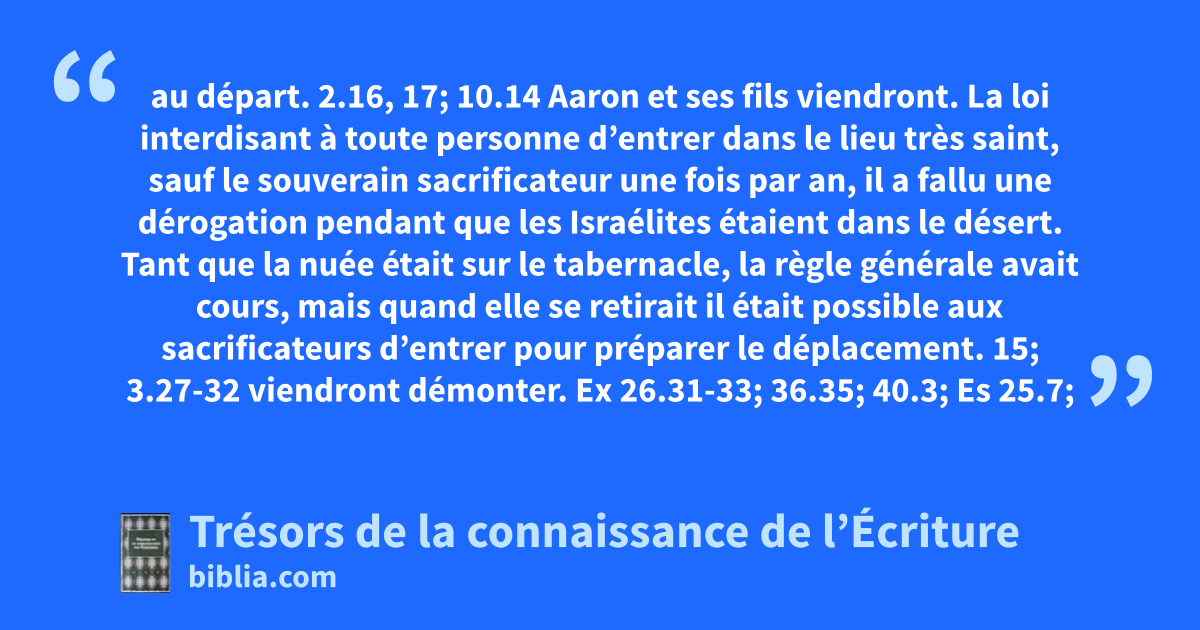 au départ. 2.16, 17; 10.14 Aaron et ses fils viendront. La loi interdisant à toute personne d’entrer dans le lieu très saint, sauf le souverain sacrificateur une fois par an, il a fallu une dérogation pendant que les Israélites étaient dans le désert. Tant que la nuée était sur le tabernacle, la règle générale avait cours, mais quand elle se retirait il était possible aux sacrificateurs d’entrer pour préparer le déplacement. 15; 3.27-32 viendront démonter. Ex 26.31-33; 36.35; 40.3; Es 25.7; Mt 27.51; Hé 9.3; 10.20 ils en couvriront. Ex 25.10-22; 37.1-9; 2S 6.2-9