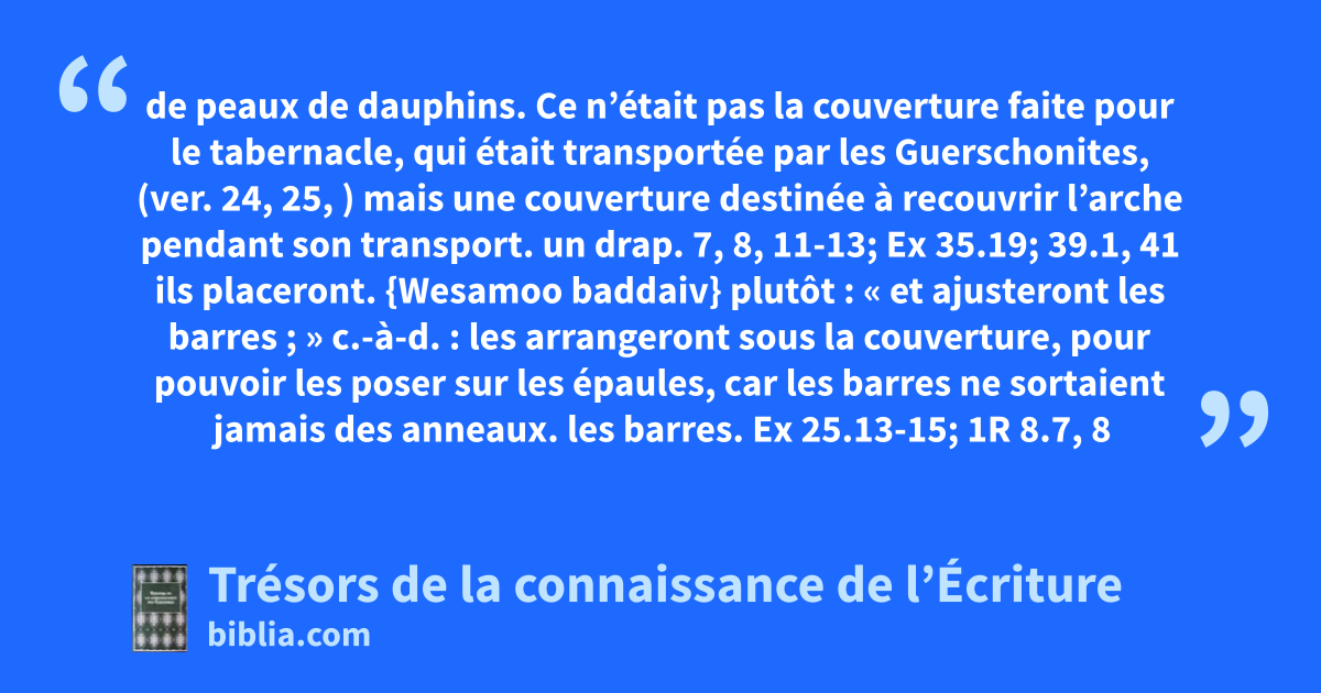 de peaux de dauphins. Ce n’était pas la couverture faite pour le tabernacle, qui était transportée par les Guerschonites, (ver. 24, 25, ) mais une couverture destinée à recouvrir l’arche pendant son transport. un drap. 7, 8, 11-13; Ex 35.19; 39.1, 41 ils placeront. {Wesamoo baddaiv} plutôt : « et ajusteront les barres ; » c.-à-d. : les arrangeront sous la couverture, pour pouvoir les poser sur les épaules, car les barres ne sortaient jamais des anneaux. les barres. Ex 25.13-15; 1R 8.7, 8