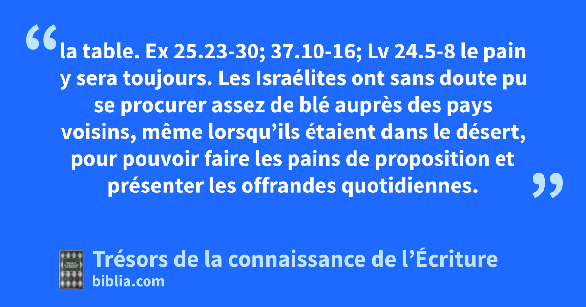 la table. Ex 25.23-30; 37.10-16; Lv 24.5-8 le pain y sera toujours. Les Israélites ont sans doute pu se procurer assez de blé auprès des pays voisins, même lorsqu’ils étaient dans le désert, pour pouvoir faire les pains de proposition et présenter les offrandes quotidiennes.