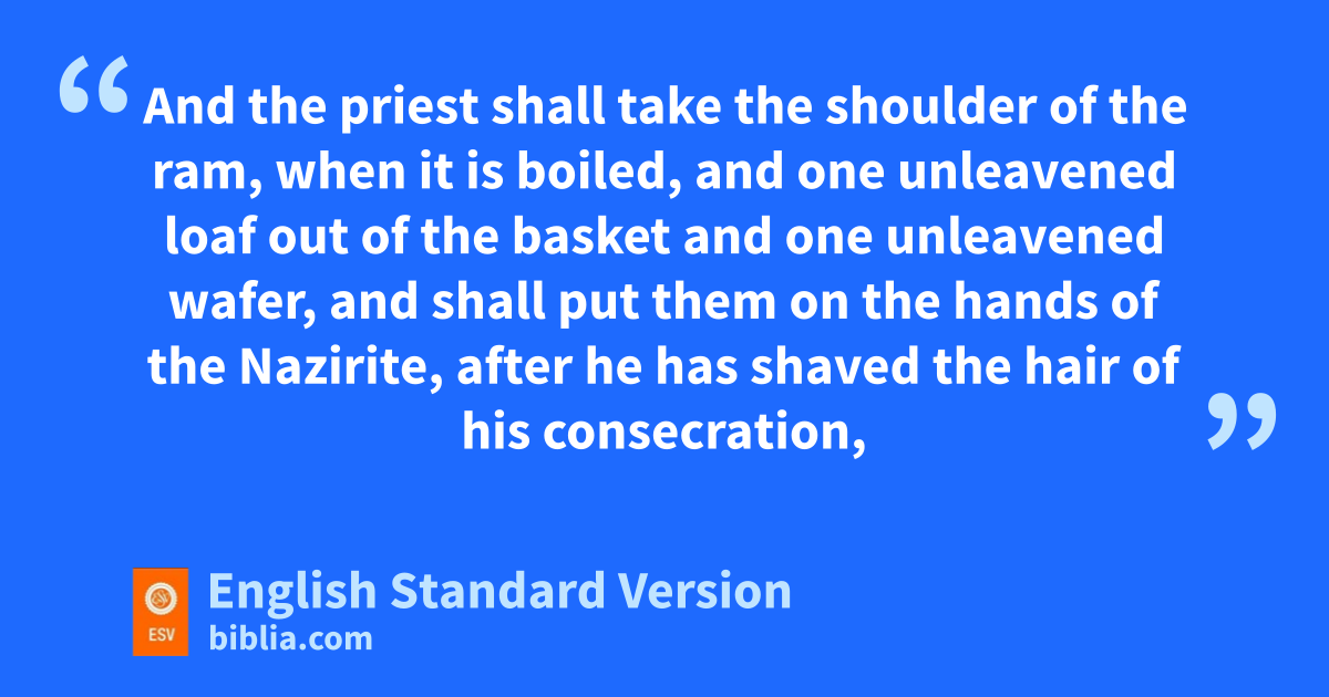 13 “And this is the law for the Nazirite, owhen the time of his separation has been completed: he shall be brought to the entrance of the tent of meeting, 14 and he shall bring his gift to the Lord, one male lamb a year old without blemish for a burnt offering, and one ewe lamb a year old without blemish pas a sin offering, and one ram without blemish qas a peace offering, 15 and a basket of unleavened bread, rloaves of fine flour mixed with oil, and unleavened wafers smeared with oil, and their sgrain offering and their tdrink offerings. 16 And the priest shall bring them before the Lord and offer uhis sin offering and his burnt offering, 17 and he shall offer the ram as a sacrifice of peace offering to the Lord, with the basket of unleavened bread. The priest shall offer also its grain offering and its drink offering. 18 And the Nazirite vshall shave his consecrated head at the entrance of the tent of meeting and shall take the hair from his consecrated head and put it on the fire that is under the sacrifice of the peace offering. 19 And the priest shall take the wshoulder of the ram, when it is boiled, and one unleavened loaf out of the basket and one unleavened wafer, and xshall put them on the hands of the Nazirite, after he has shaved the hair of his consecration, 20 and the priest shall wave them for a wave offering before the Lord. yThey are a holy portion for the priest, together with the breast that is waved and the thigh that is contributed. And after that the Nazirite may drink wine.